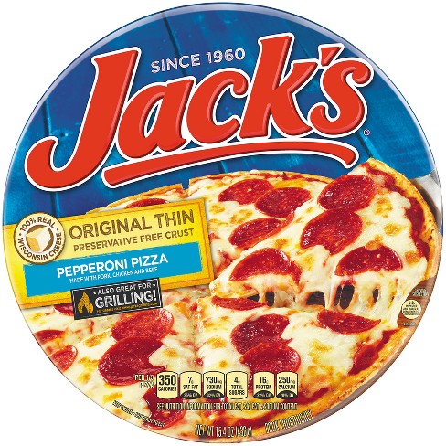 Calories in Jack's Pizza | CalorieKing Original Bacon Cheeseburger Frozen Pizza. Original Spicy Italian Sausage Frozen Pizza. Original Mexican Style Frozen Pizza. Original Cheese Frozen Pizza. Original Canadian Style Bacon Frozen Pizza. Original Sausage & Mushroom Frozen Pizza. Naturally Rising Pepperoni Frozen Pizza. Original Hamburger Frozen Pizza.
