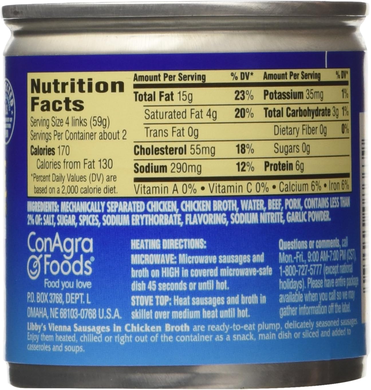 Maple Leaf Vienna Sausage - 113g | East Coast Catalog Maple Leaf Vienna Sausage - 113g | East Coast Catalog Home Maple Leaf Vienna Sausage - 113g Maple Leaf Vienna Sausage - 113g East Coast Catalog $5.48 CAD Qty. Add to Cart Qty available: 11 NOW AVAILABLE! Vienna Sausage delivers classic, mouthwatering flavour that's great any time of day. NEW Maple Leaf Canned Vienna Sausage, 24 x 113g BB2022NOV12 $48 CANNED VIENNA SAUSAGES: A convenient and delicious pantry stapleLONG-LASTING: Shelf-stable canned sausages stays fresh longerQUICK AND TASTY: Great cooked or straight out of the canREADY TO EAT: Precooked and smoked canned sausages ... Food; NEW Maple Leaf Canned Vienna Sausage, 24 x 113g BB2022NOV12 $48 (139073303) Vienna Sausage Nutrition Facts • MyFoodDiary® Log food: Maple Leaf Vienna Sausages Canned. 0.5 can (56g) Nutrition Facts. 120 calories. Log food: Goya Chicken Vienna Sausages Canned. 4 sausages (50g) Nutrition Facts. 120 calories. Log food: Brookdale Vienna Sausage. 1 can (130g) Nutrition Facts. 210 calories. Log food: Eat better. Feel better. Learn more MyFoodDiary. Top brands. Trader Joe ...