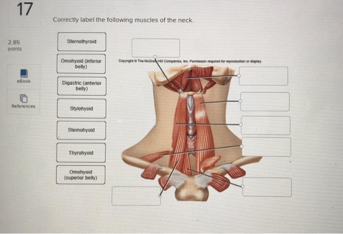 Solved Correctly label the following muscles of the neck. - Chegg Anatomy and Physiology. Anatomy and Physiology questions and answers. Correctly label the following muscles of the neck. Stylohyoid Omohyoid (superior belly) Sternohyoid Mylohyoid Thyrohyoid (inferior (anterior belly) posterior Sternothyroid Reset Zoom くPrev 31of 50Hİ Next: Question: Correctly label the following muscles of the neck ...