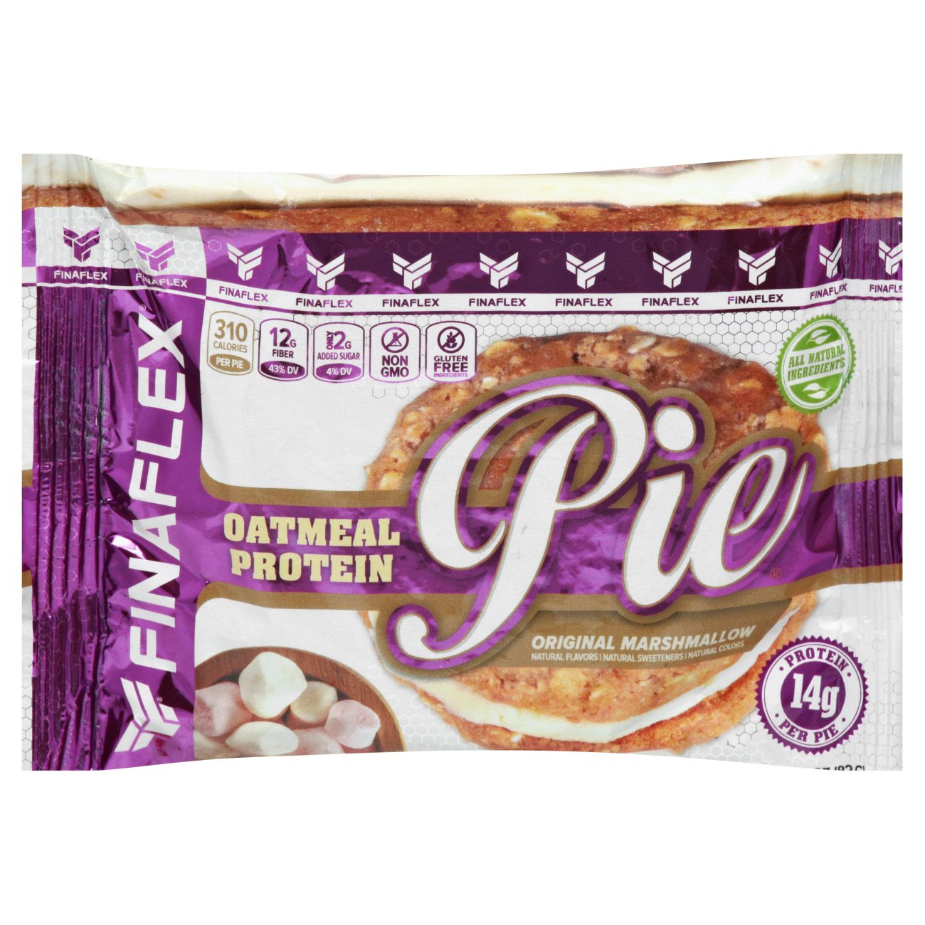 Finaflex Oatmeal Protein Pie Orgl Marshmallow 4ct - Walmart.com OATMEAL PROTEIN PIE? sandwiches two soft and chewy oatmeal cookies together with a marshmallow filling, creating a taste that will leave you scratching your head on how a healthy food can taste this good. Hungry yet? Stop reading...get to eating! 14 Grams of Protein per Pie 12 Grams of Fiber Made with all natural ingredients Non GMO Gluten Free