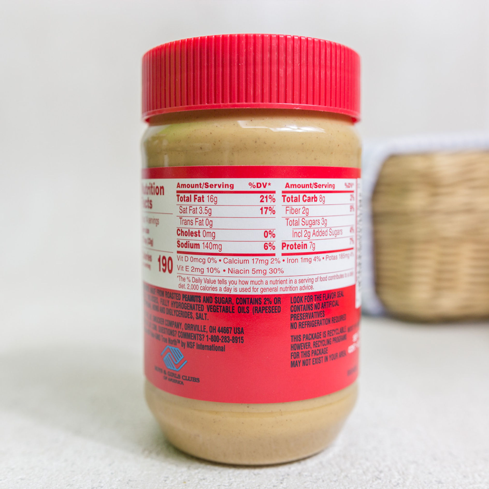 Jiffy peanut butter nutrition label. Simply Jif® Peanut Butter | Jif Simply Jif Peanut Butter Contains 2g Total Sugar per Serving. Regular Jif Peanut Butter Contains 3g Total Sugar per Serving. Low Sodium* 7g Protein per Serving* *See Nutrition Information for Fat and Saturated Fat Content Gluten Free Contains No Artificial Preservatives Kosher Pareve Non-GMO Certified by NSF Allergens Contains peanuts Extra Crunchy Peanut Butter | Jif 5 % Total Carbohydrate 8g 3 % Dietary Fiber 2g 9 % Total Sugars 3g Incl 2g of Added Sugars 3 % Protein 7g 7 % Vitamin D 0mcg 0% Calcium 18mg 2% Iron 1mg 4% Potassium 190mg 4% Vitamin E 2mg 10% Niacin 5mg 30% Calories in Jiffy Peanut Butter - SparkPeople Other User Submitted Calorie Info Matching: Jiffy Peanut Butter Jiffy Peanut Butter And Honey Creamy (1 serving) Calories: 190 , Fat: 15g , Carbs: 11g , Protein: 6g Light Creamy Peanut Butter - Jif Jif Creamy Peanut Butter is perfect on toast, in smoothies or eating by the spoonful. Available sizes: 500g, 1kg. Ingredients. ROASTED PEANUTS, GLUCOSE SOLIDS, SUGAR, SALT, HYDROGENATED VEGETABLE OIL, MONO AND DIGLYCERIDES, COOKING MOLASSES, VEGETABLE OIL. ... Nutritional Information . Product Name. Select a format. Select a retailer below to ...