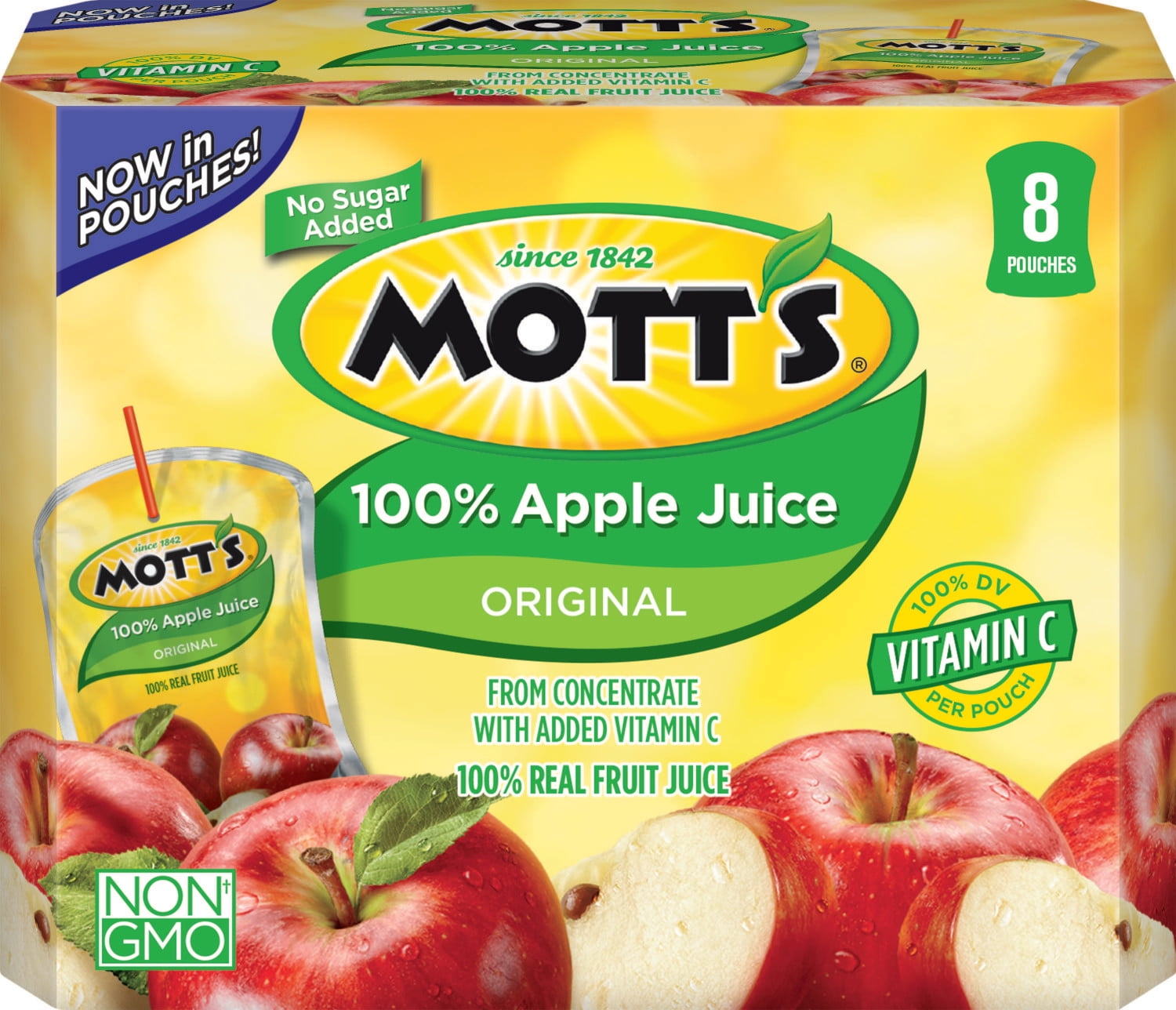 Mott's 100% Apple Juice (6.75 fl oz) Delivery or Pickup Near Me Packed with ripe apple flavor, Mott's Apple Juice is 100% fruit juice and delivers 1-1/2 servings of fruit per pouch*. They are convenient, no-mess drink ...