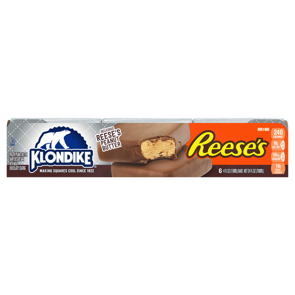 Klondike Reese's Peanut Butter Dairy Dessert Bar - 6 Count Nutrition Facts 6 Servings Per container Serving Size 1 bar (77g) Amount Per Serving Calories 250 % Daily Value * Total Fat 15 g 19% Saturated Fat 10 g 50% Trans Fat 0 g Cholesterol < 5 mg 1% Sodium 105 mg 5% Total Carbohydrate 26 g 9% Dietary Fiber < 1 g 3% Total Sugars 18 g Added Sugars 14 g 28% Protein 3 g Vitamin D 0 mcg 0% Calcium 70 mg 6%