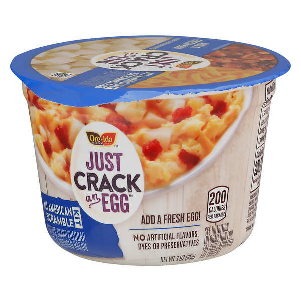 Just Crack an Egg, Protein Packed Scramble Kit - Eat This Much Ore-Ida ; For a Serving Size of 1 package (as packaged) (63g) ; How many calories are in Just Crack an Egg, Protein Packed Scramble Kit? Amount of calories in ... Just Crack an Egg, Protein Packed Scramble Kit - Nutritionix Aug 20, 2022 ... Just Crack an Egg, Protein Packed Scramble Kit ; Vitamin D · 0.4mcg micrograms 2% ; Calcium 190mg milligrams 15% ; Iron · milligrams 0% ... Protein Packed Scramble Breakfast Bowl Kit | Just Crack An Egg Our Protein Packed scramble features uncured bacon, pork sausage and melty cheddar cheese. Just add a fresh egg and it's ready in less than two minutes!