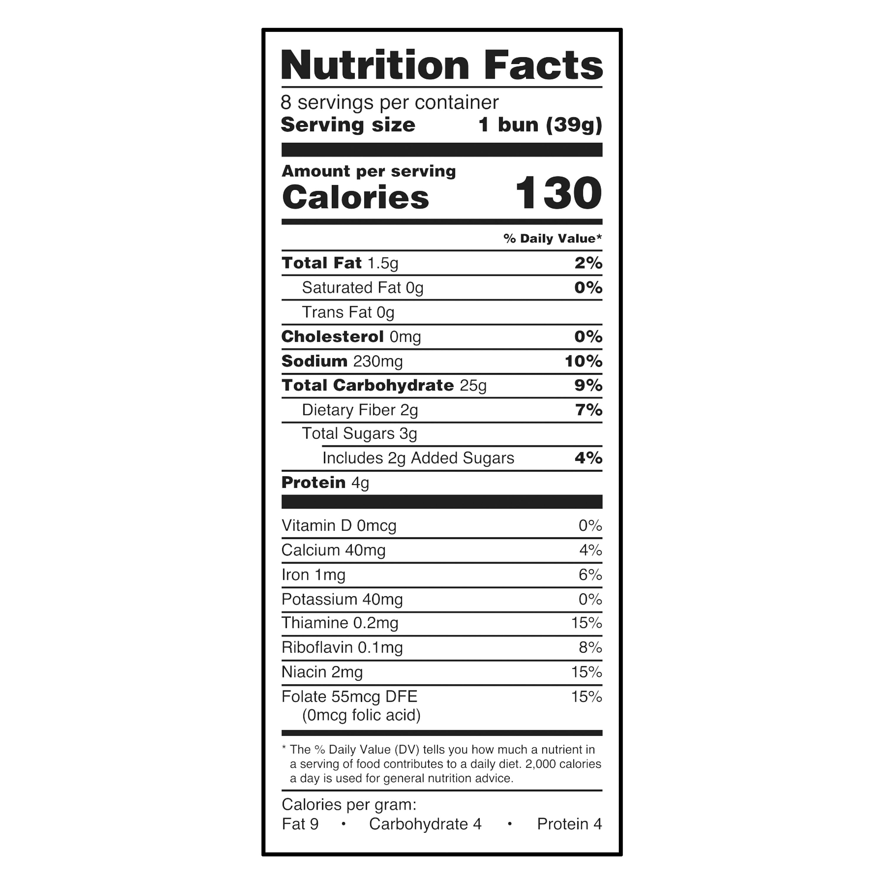 Nutrition Facts for Great Value White Hamburger Bun Great Value White Hamburger Bun Nutrition Facts Serving Size bun 1 bun = 40g Amount Per Serving 130 Calories % Daily Value* 2% Total Fat 1.5g 0% Saturated Fat 0g Trans Fat 0g 0% Cholesterol 0mg 10% Sodium 230mg 8% Total Carbohydrate 25g 7% Dietary Fiber 2g Total Sugars 3g 4% Includes 2g Added Sugars Protein 4g 0% Vitamin D 0mcg 3% Calcium 40mg
