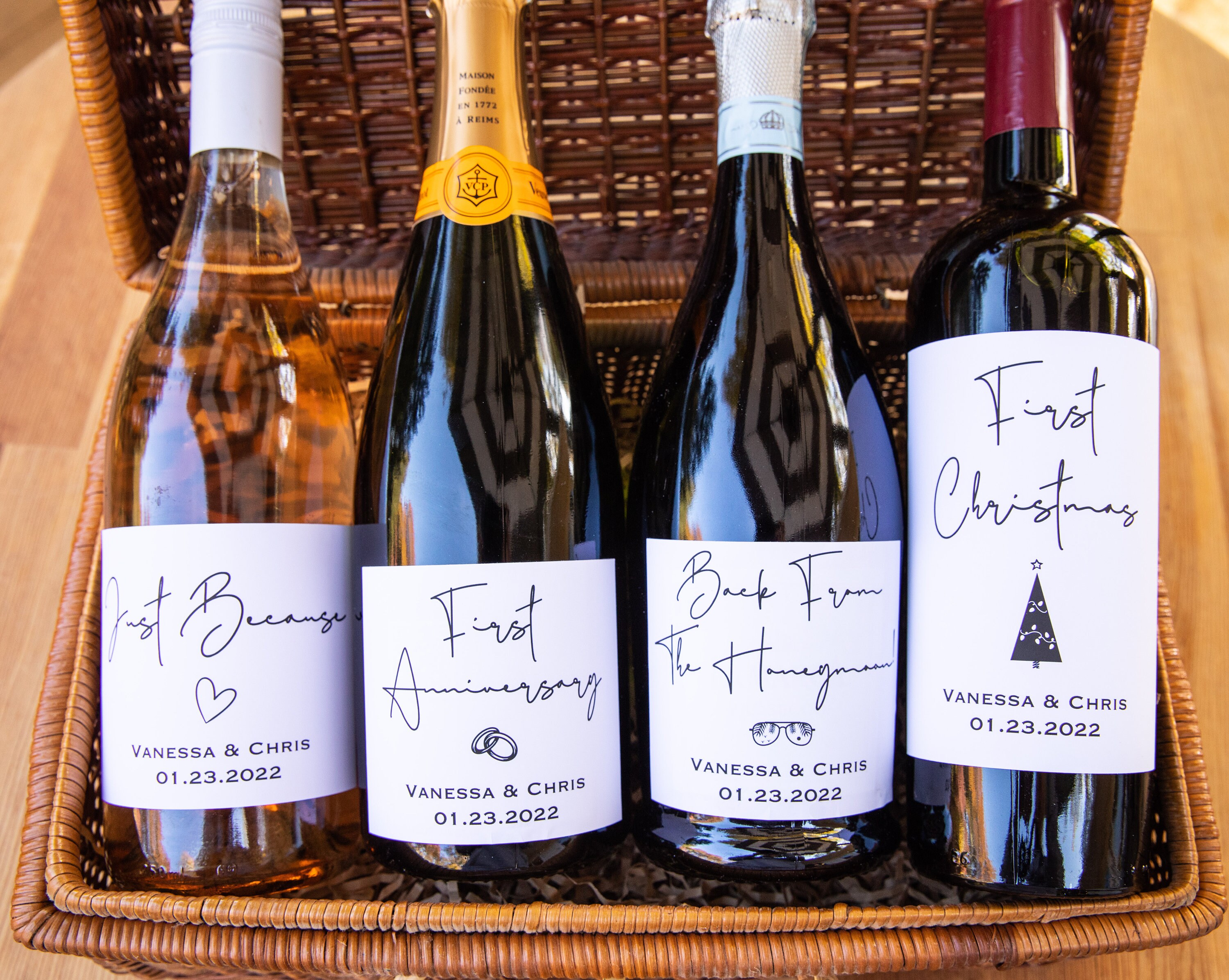 Milestone Wine Basket with Free Lables | Years of Firsts Gift The wedding wine basket tag is a PDF, and it is not personalized, meaning none of these poems include the bride or groom's name. Therefore, it's easy for you to simply print, cut, and attach. No formatting necessary 🙂 Making the Wine Basket Tags First, I printed the wine tag sheet out on thick manila paper.