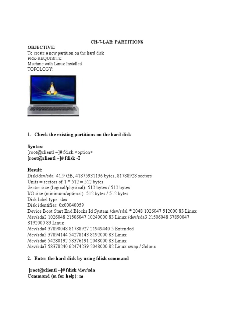 PDF Partitioning Disks with parted - Red Hat Customer Portal Disk Flags: Number Start End Size Type File system Flags 2. Create a partition: Create a 1000M partition on the msdos partition table as follows: (parted) ... On MS-DOS disk labels, the primary partitions number from 1 to 4, logical partitions from 5 onwards. FLAG is one of: boot, root, swap, hidden, raid, lvm, lba, hp-service, palo, ... Can I change an existing partition from MBR to GPT? DOS partition table format can not be used on drives for volumes larger than (2199023255040 bytes) for 512-byte sectors. Use parted (1) and GUID partition table format (GPT). This is what makes me think I need to change sdb to GPT. - Dagonar May 9, 2018 at 22:38 Show 2 more comments 1 Answer Sorted by: 3 fdisk: manipulate disk partition table - Linux Manuals (8) BSD/Sun-type. A BSD/Sun disklabel can describe 8 partitions, the third of which should be a `whole disk' partition. Do not start a partition that actually uses its first sector (like a swap partition) at cylinder 0, since that will destroy the disklabel. Note that a BSD label is usually nested within a DOS partition. IRIX/SGI-type